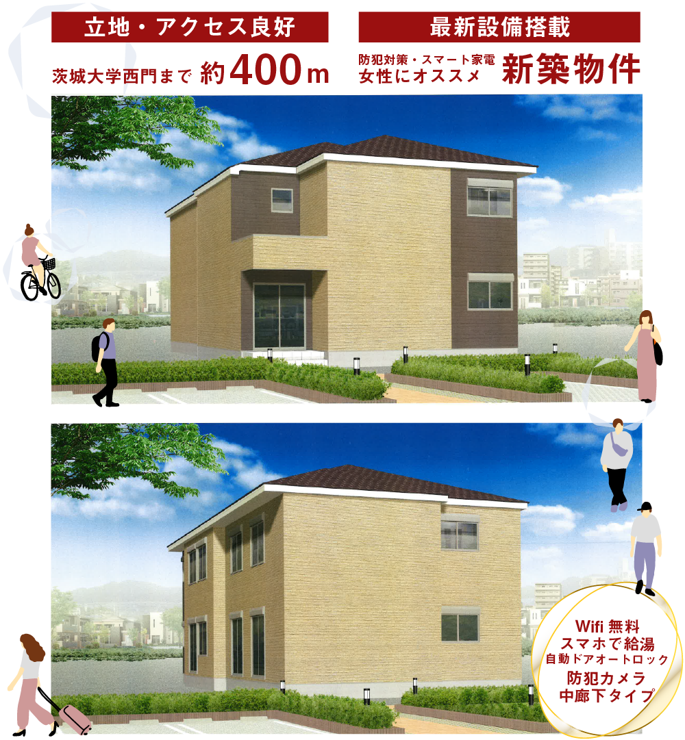 茨城大学西門まで約400mの好立地です!Wifi無料!スマホで給湯!三面鏡!